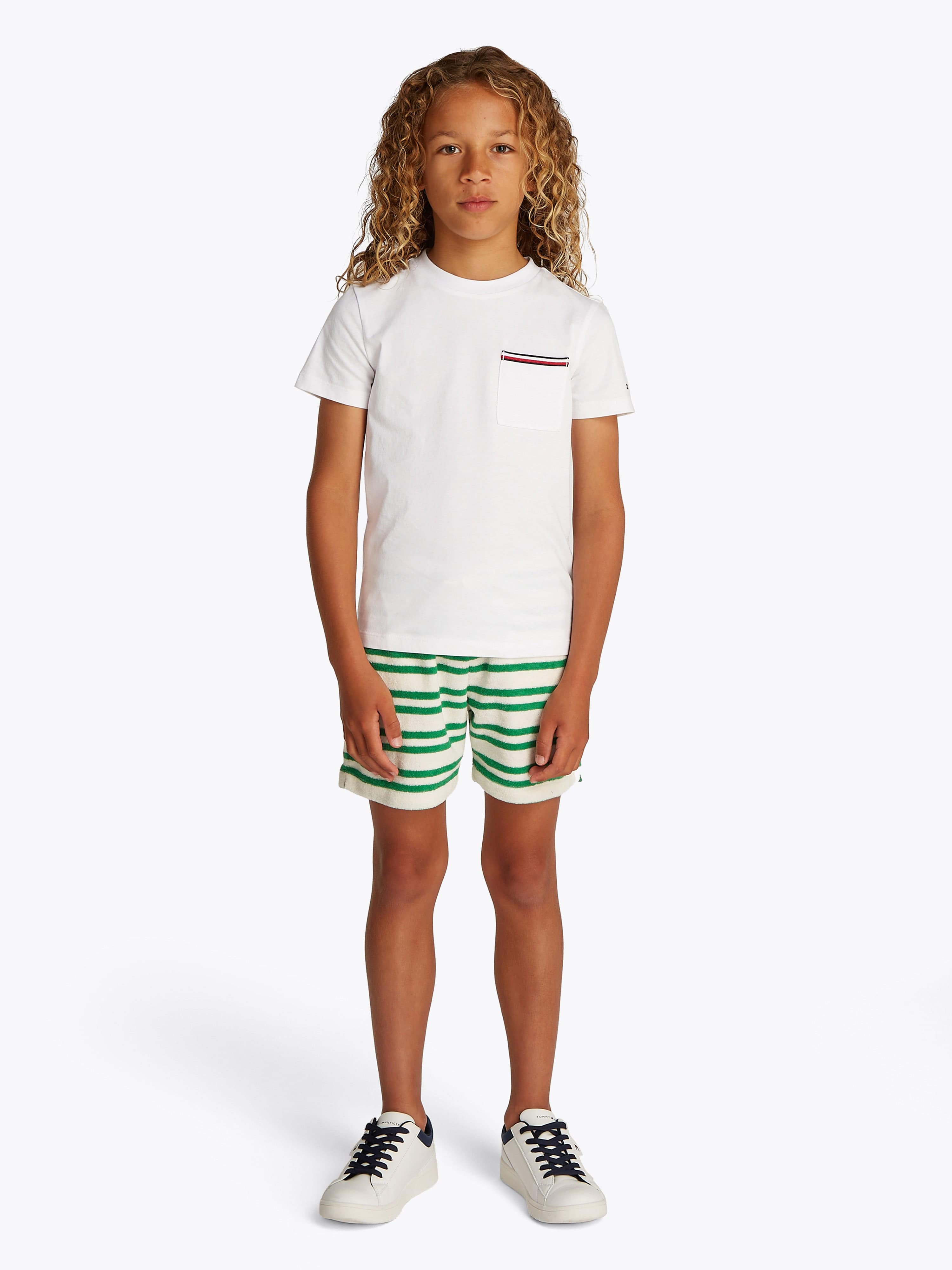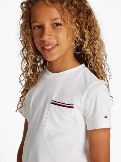 Elevate your young gentleman's wardrobe with the Tommy Hilfiger Boys Pocket T-Shirt in White for SS2025. Marrying comfort with iconic style, this striking piece is a wardrobe essential. Key features include: