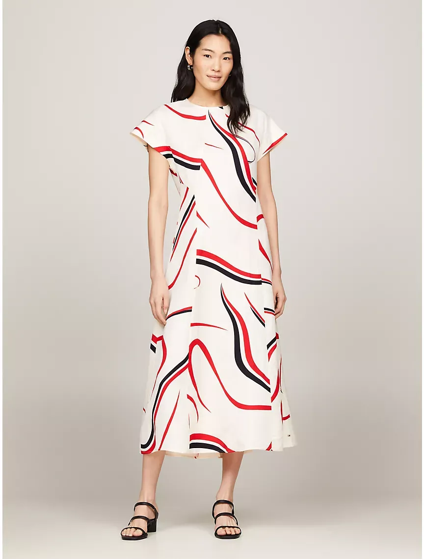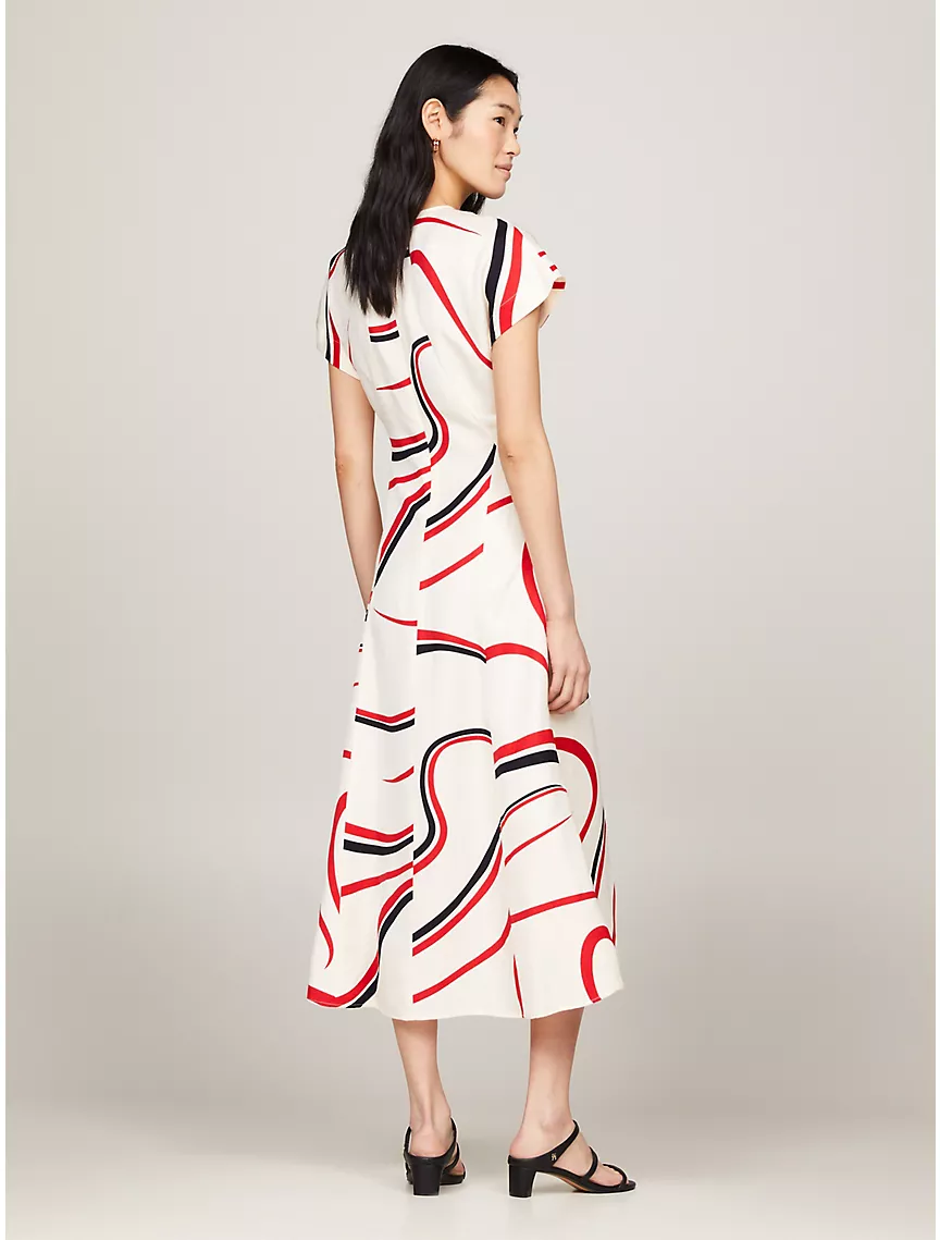 - Round neckline, hidden side zipper, open eyelet back, batwing sleeves, midi length, fully lined.