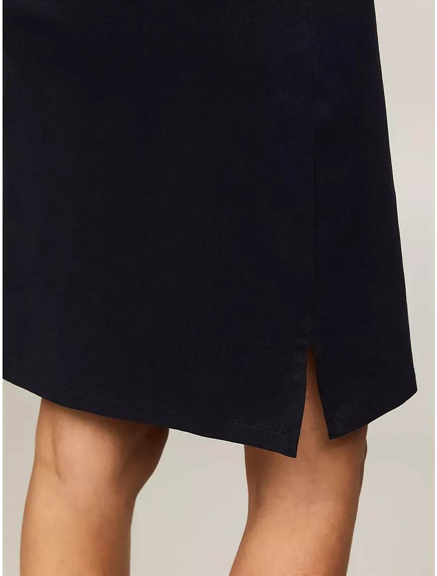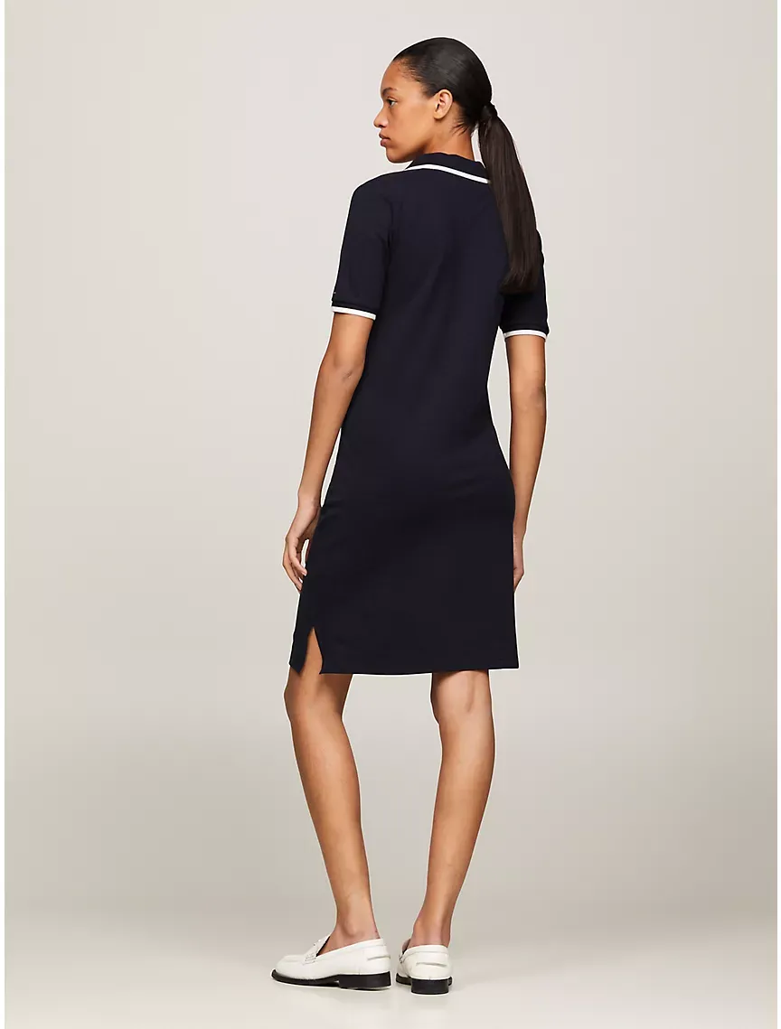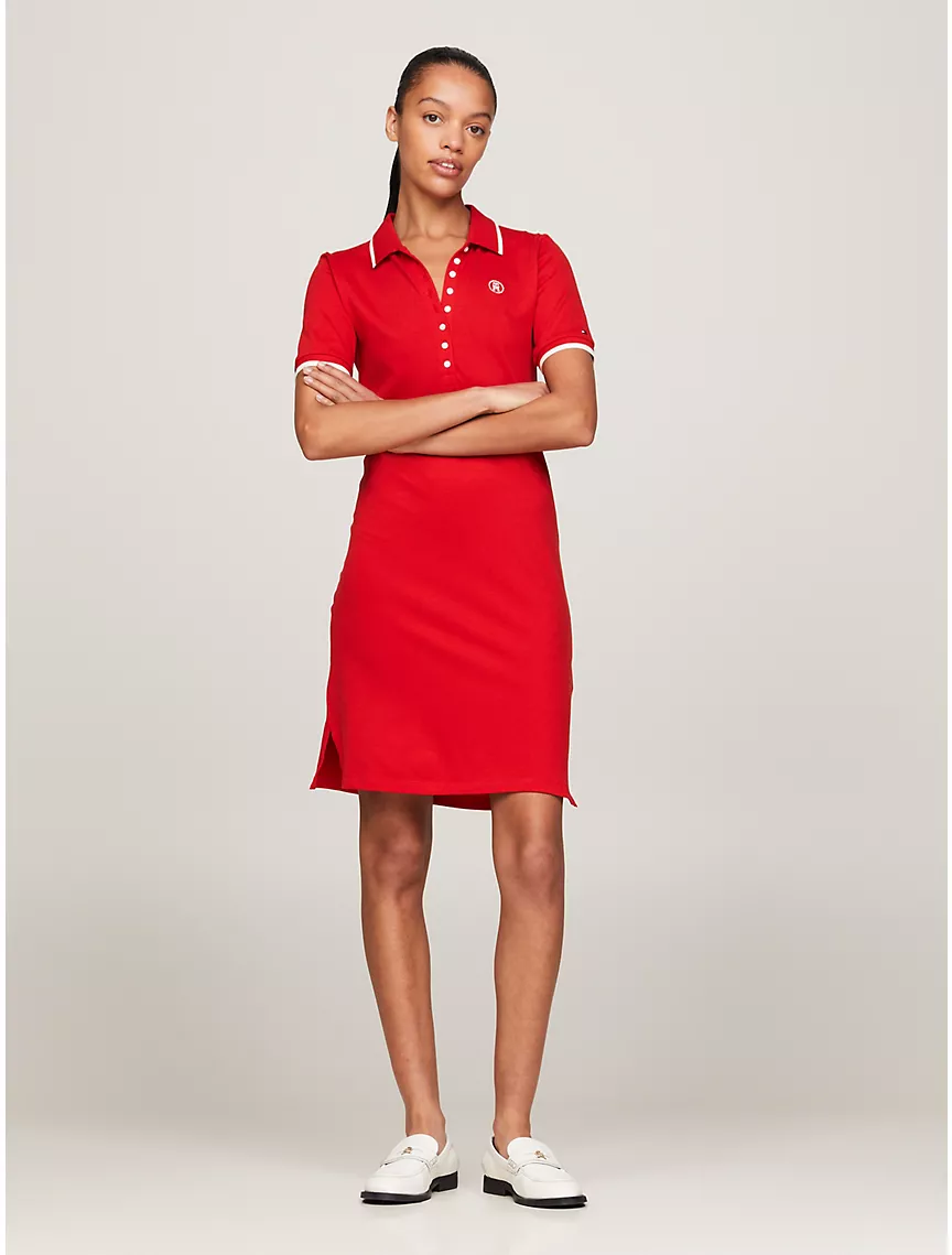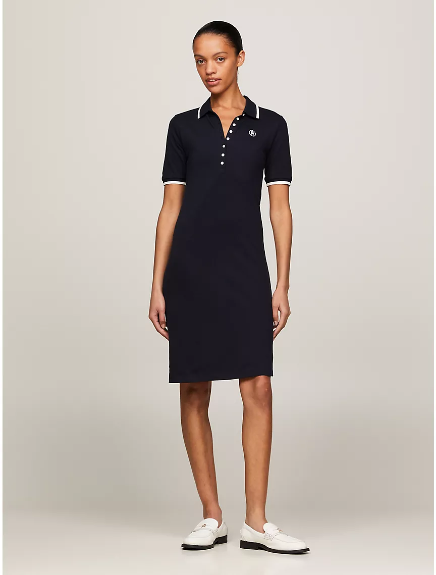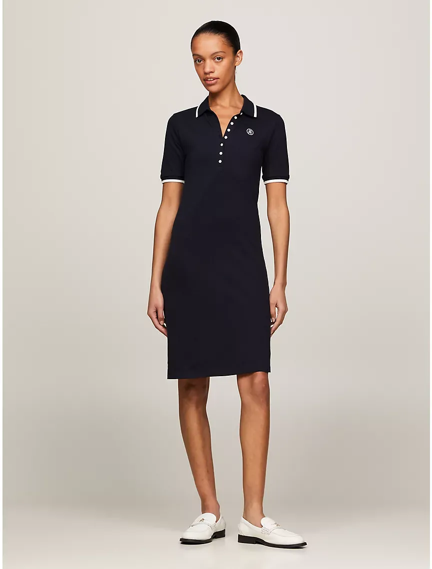 - 8-button placket, tipped polo collar and cuffs, embroidered TH monogram at chest, short sleeves, midi length.