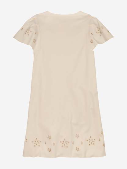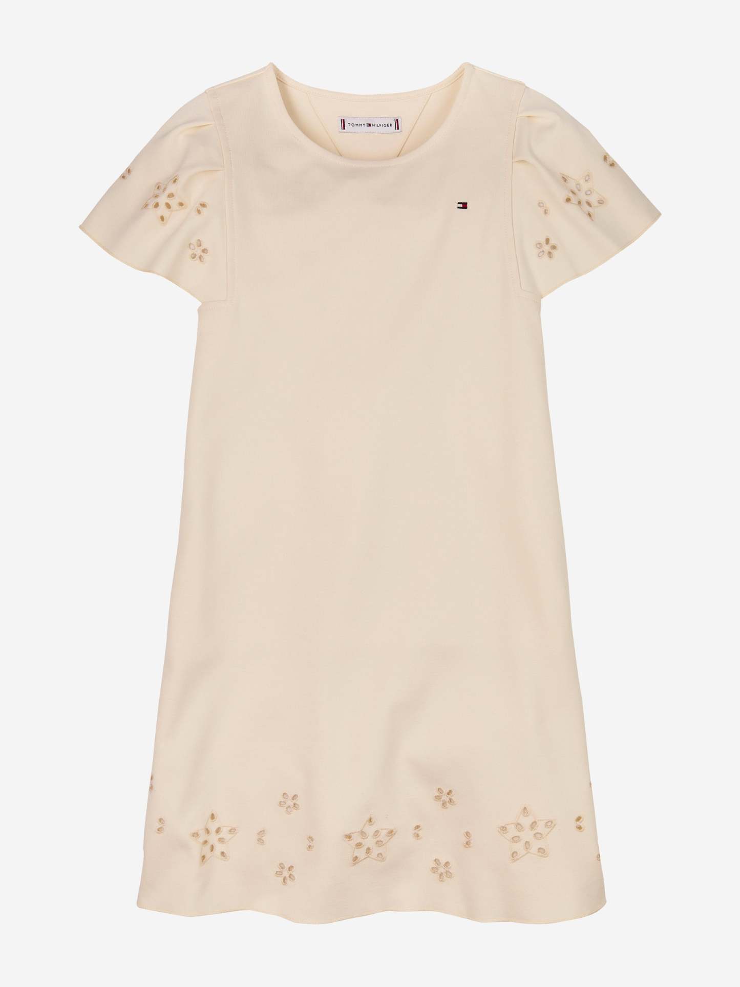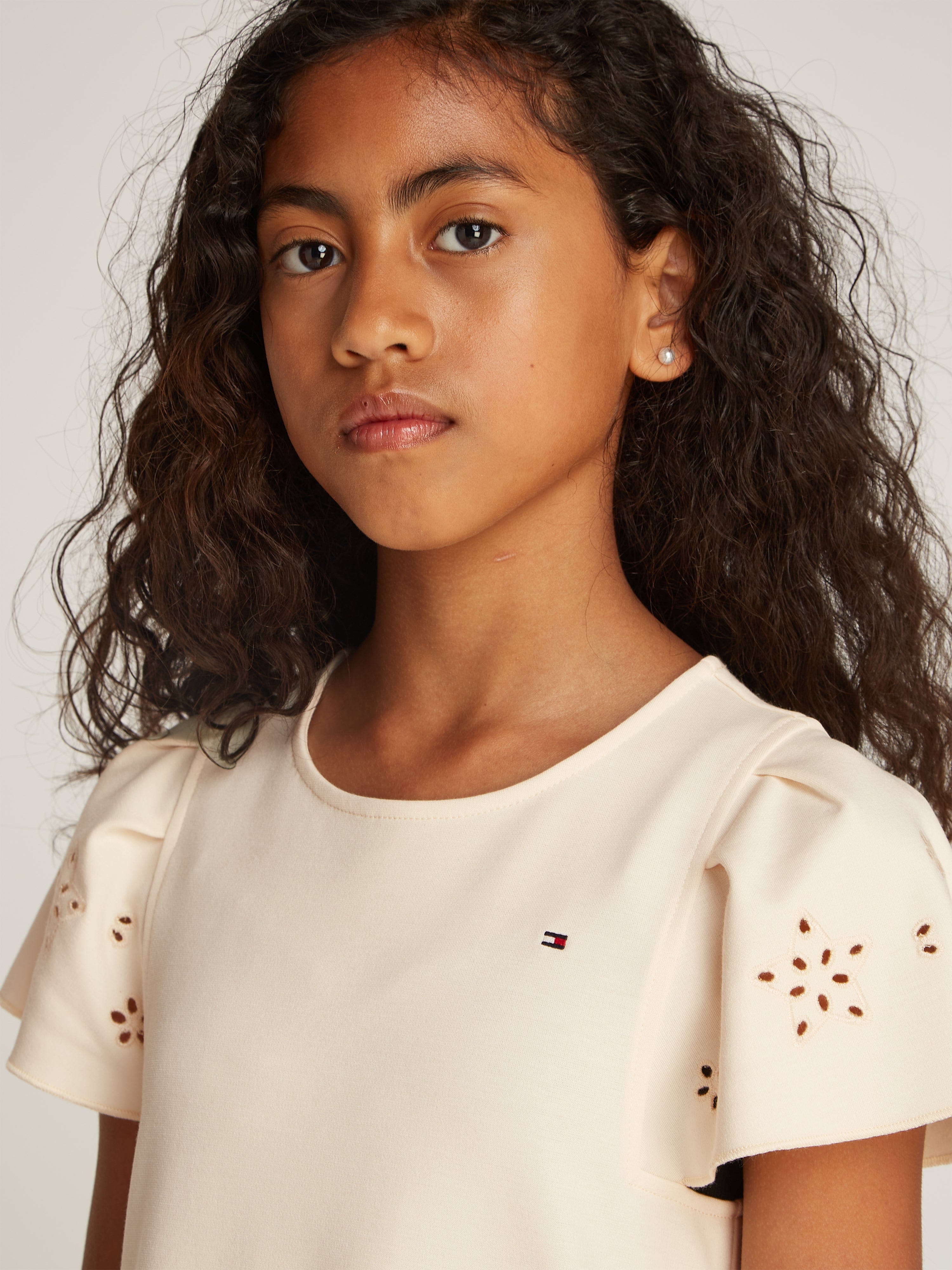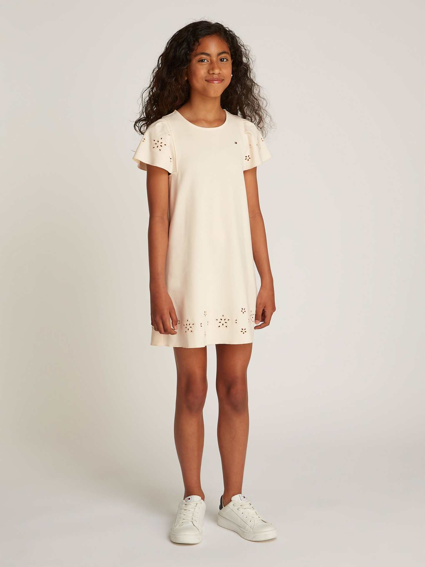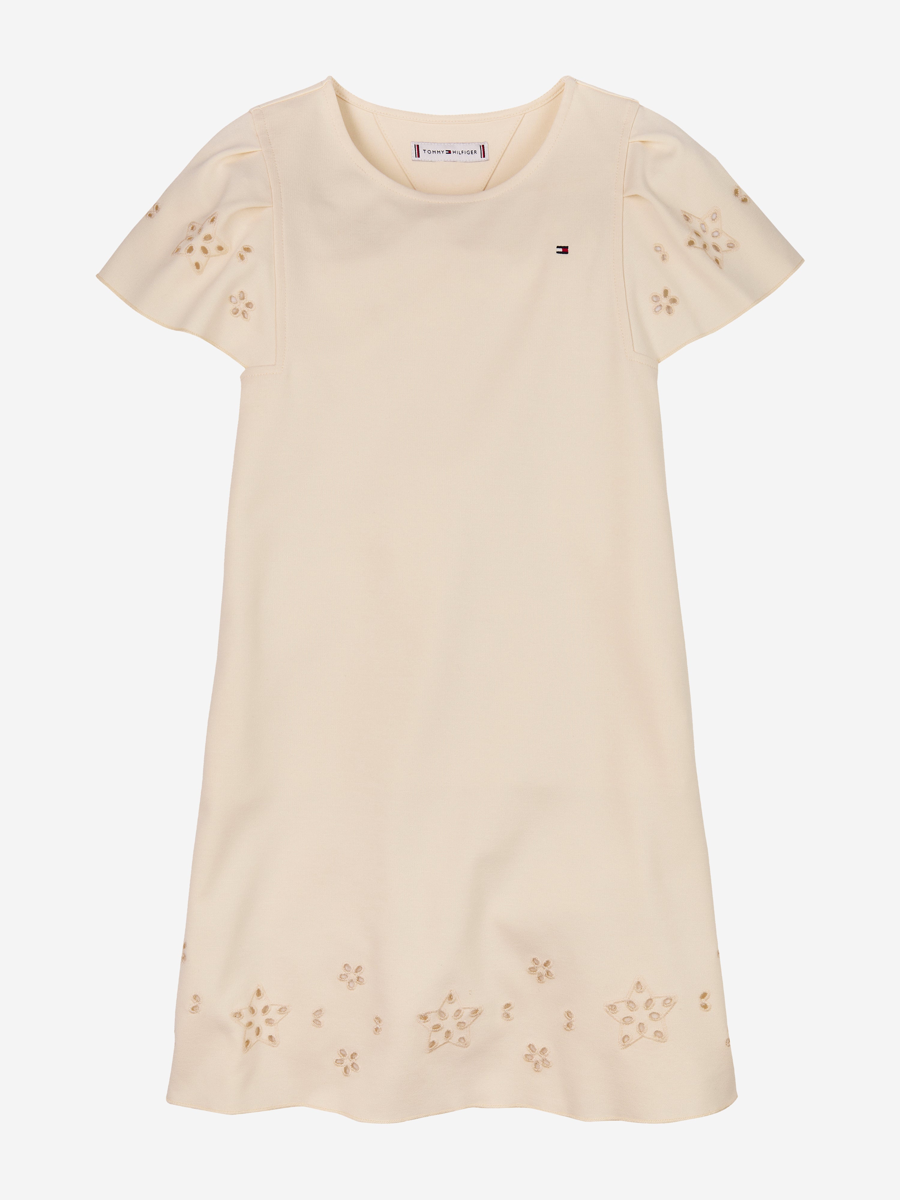 Elevate her style with the Tommy Hilfiger Girls Embroidered Flutter Dress in Ivory. Available now.