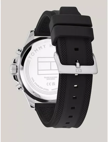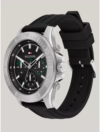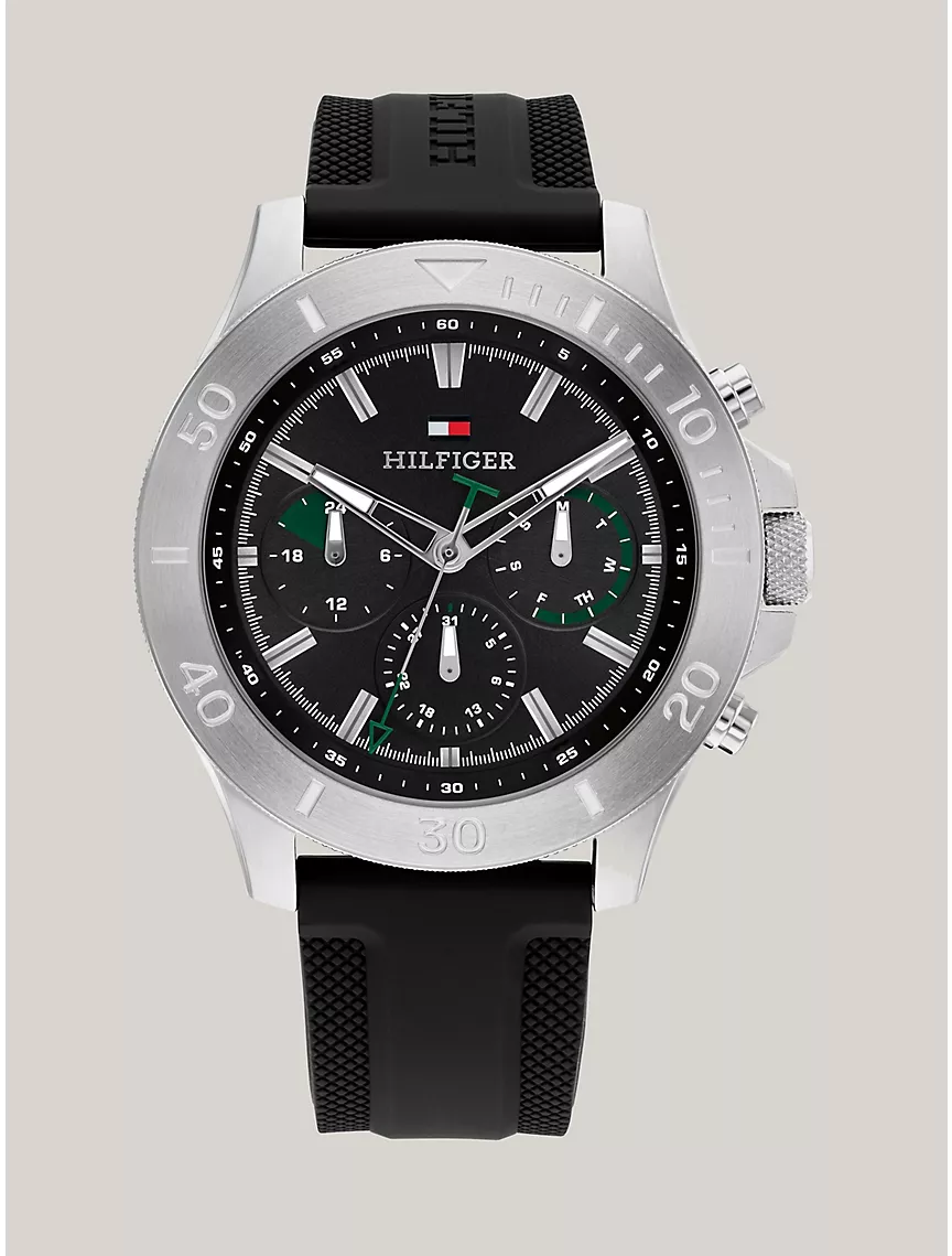 - 46mm stainless steel case, sport bezel, black dial, black silicone strap, multifunction movement, sub-dials.